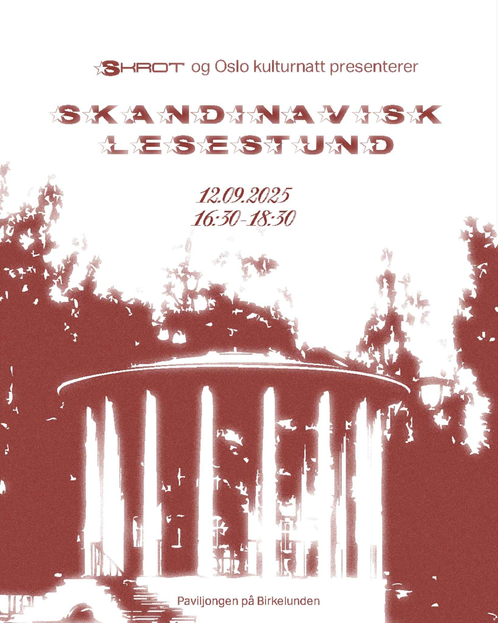 SKROT inviterte til lesestund i musikkpaviljongen i Birkelunden! Et par timer til å lese stille hver for oss, sammen. Vi tok med oss litteratur fra nyetablerte, skandinaviske forfattere som kunne lånes for de som ikke ønsket å lese medbrakt.